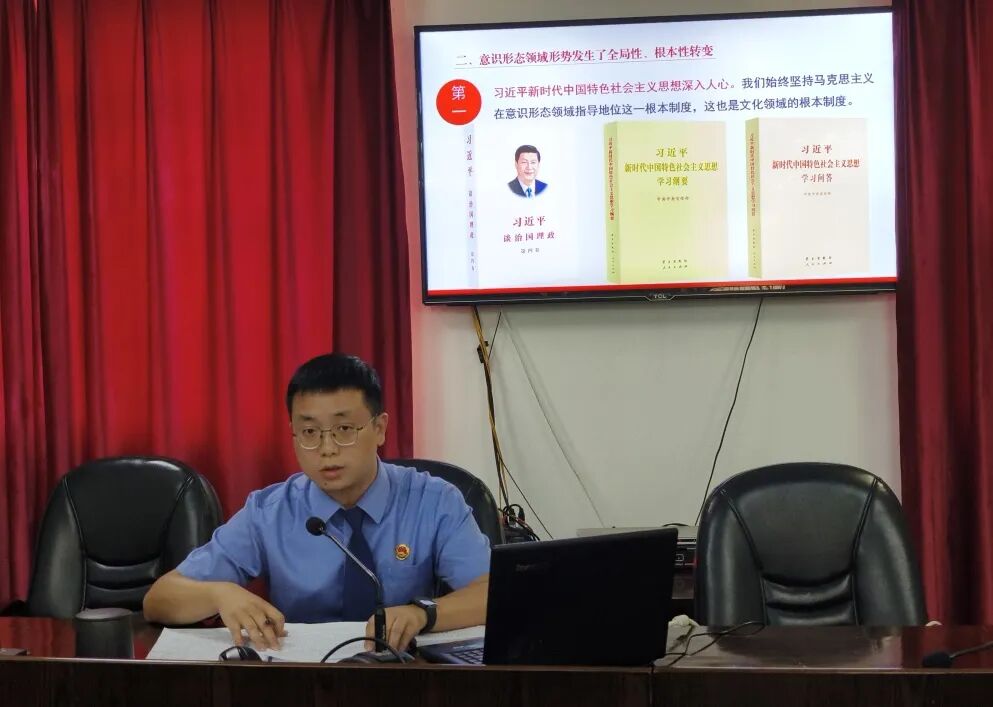 授课中,刘怡衡结合习近平总书记关于意识形态工作重要论述以及当前国际、国内形势,紧扣检察工作实际,从“意识形态的概念、意识形态领域形式的转变、意识形态工作的使命任务”等方面讲述了意识形态工作的重要性、当前意识形态工作现状及面临的挑战。课上,刘怡衡还组织全院干警和书记员进一步学习了《全市检察人员自媒体行为“十个严禁”》,要求全体检察人员在工作生活及自媒体网络活动中时刻保持清醒头脑,提高政治站位。