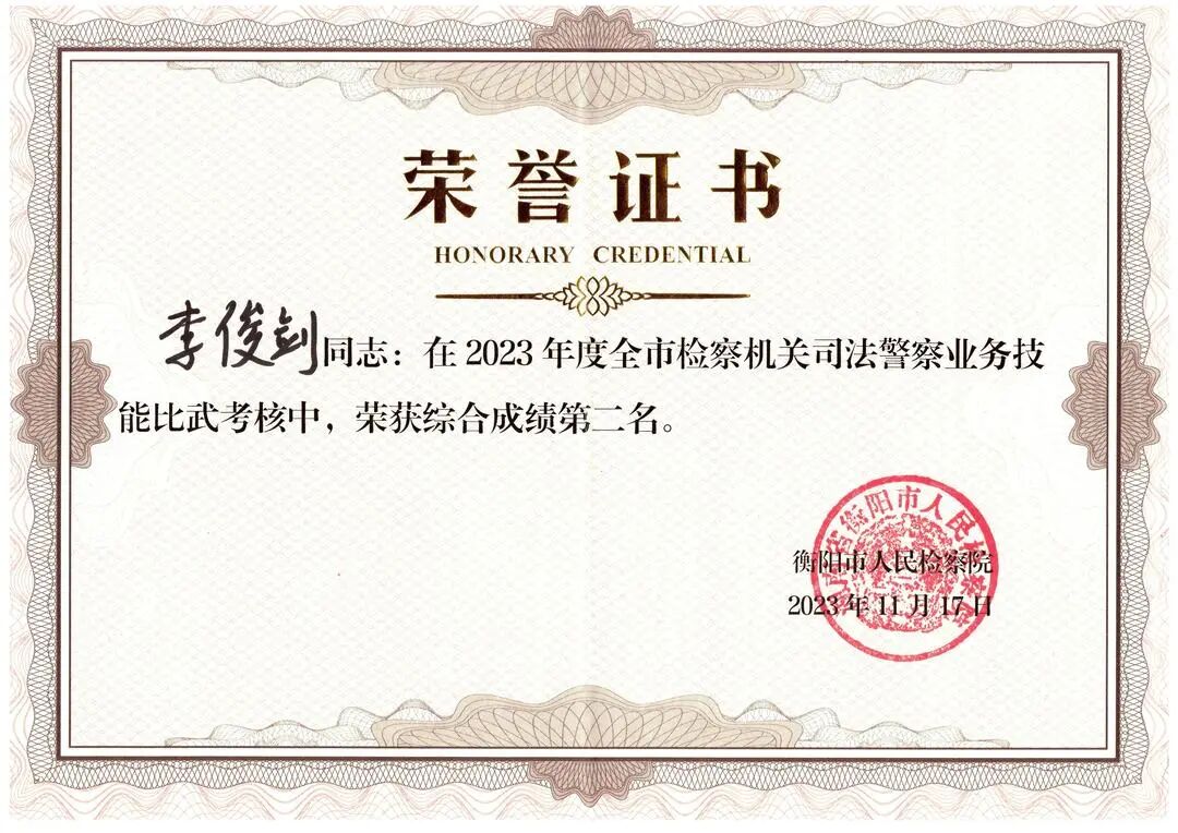 11月6日—17日,衡阳市检察机关举办2023年司法警察培训暨岗位比武练兵和年度考核验收活动。此次岗位比武练兵项目涵盖警务理论测试、人民警察基础体能、实弹射击等五项内容。经过激烈角逐,我院李俊剑同志在本次司法警察业务技能比武考核中,荣获综合成绩第二名。