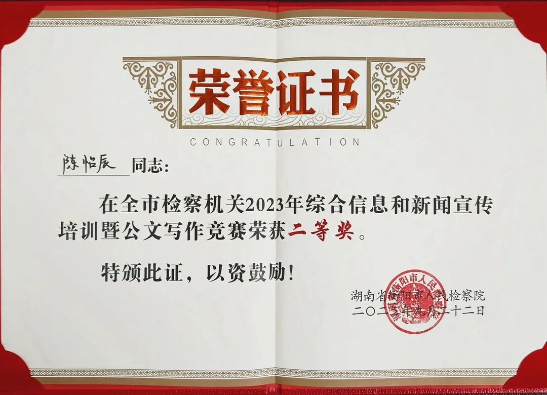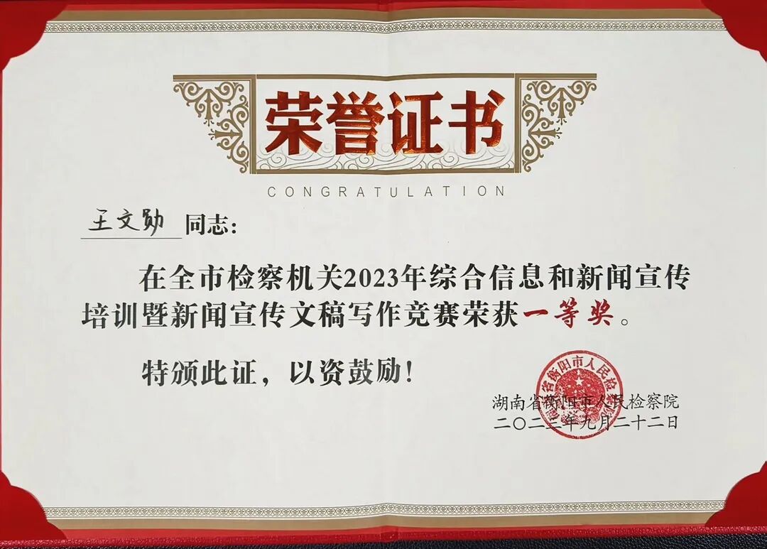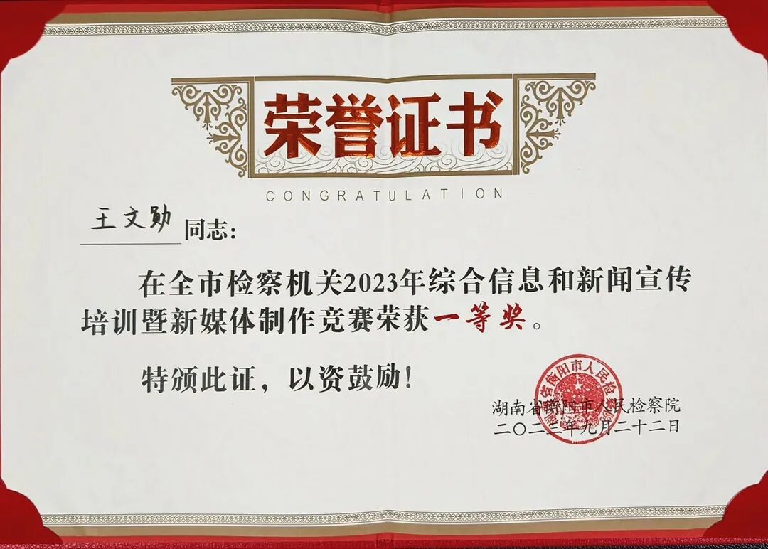 9月18日-22日,衡阳市人民检察院举办全市检察机关综合信息和新闻宣传培训班暨岗位练兵活动。经过激励角逐,我院干警王文勋、陈怡辰分别在三项竞赛中取得优秀成绩。