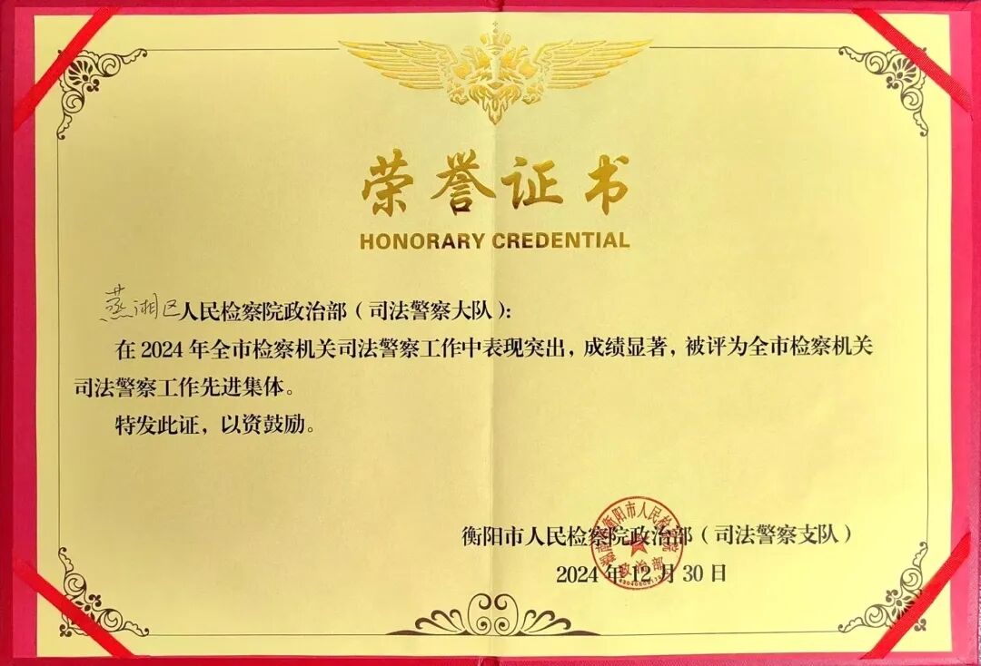 1月9日,衡阳市检察机关组织开展庆祝第五个“人民警察节”活动。活动现场,宣读了《关于表扬全市检察机关司法警察工作先进集体和先进个人的通报》,并进行了现场颁奖。蒸湘区人民检察院政治部(司法警察大队)荣获全市检察机关司法警察工作先进集体。