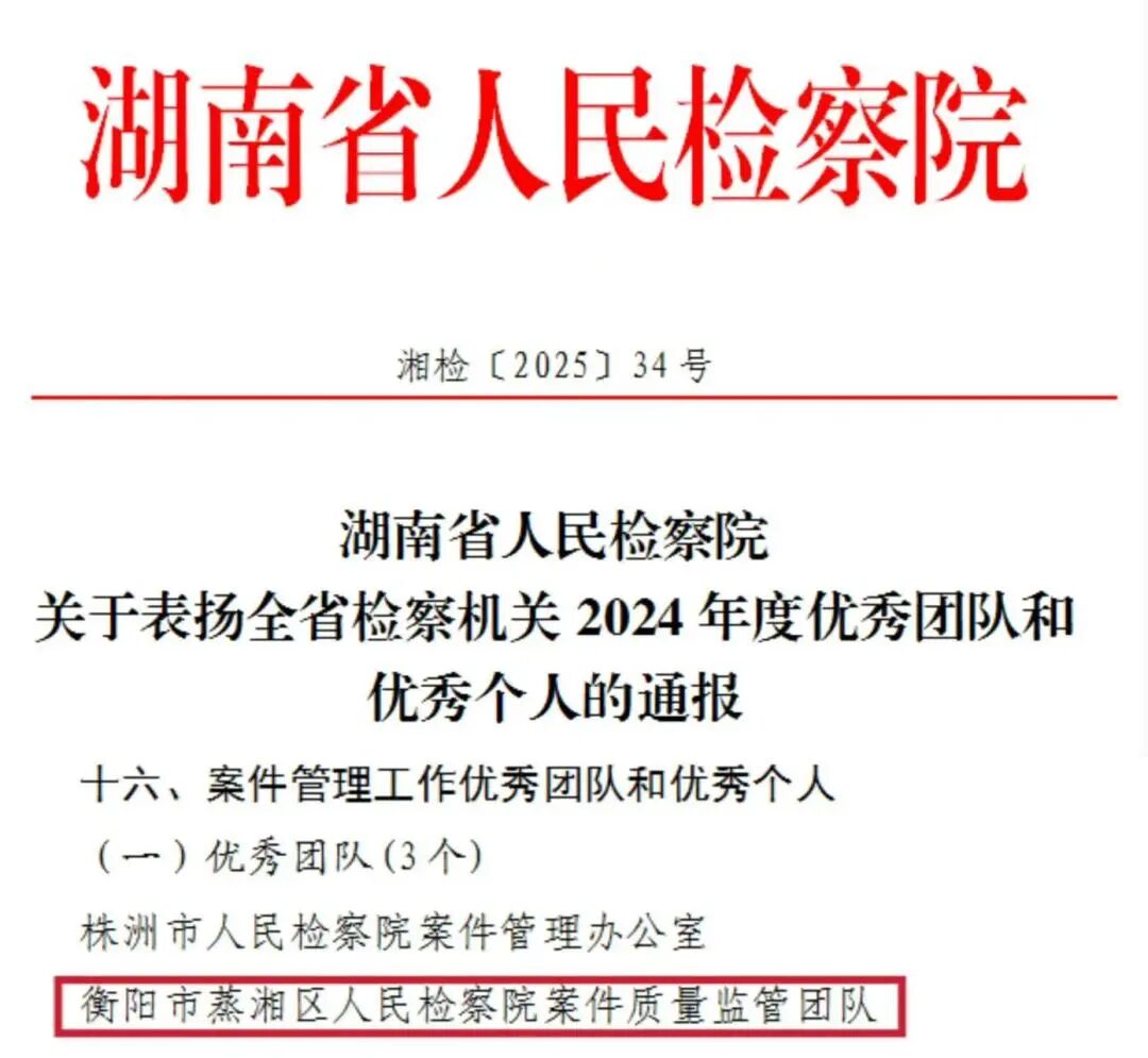 近日,湖南省人民检察院发布《关于表扬全省检察机关2024年度优秀团队和优秀个人的通报》,确定了62个优秀团队和105名优秀个人,其中衡阳市蒸湘区人民检察院案件质量监管团队荣获案件管理工作优秀团队!