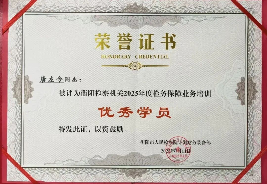 7月10日至11日,衡阳市人民检察院举办全市检察机关检务保障业务专题培训班,蒸湘区人民检察院唐左今同志荣获“优秀学员”称号。