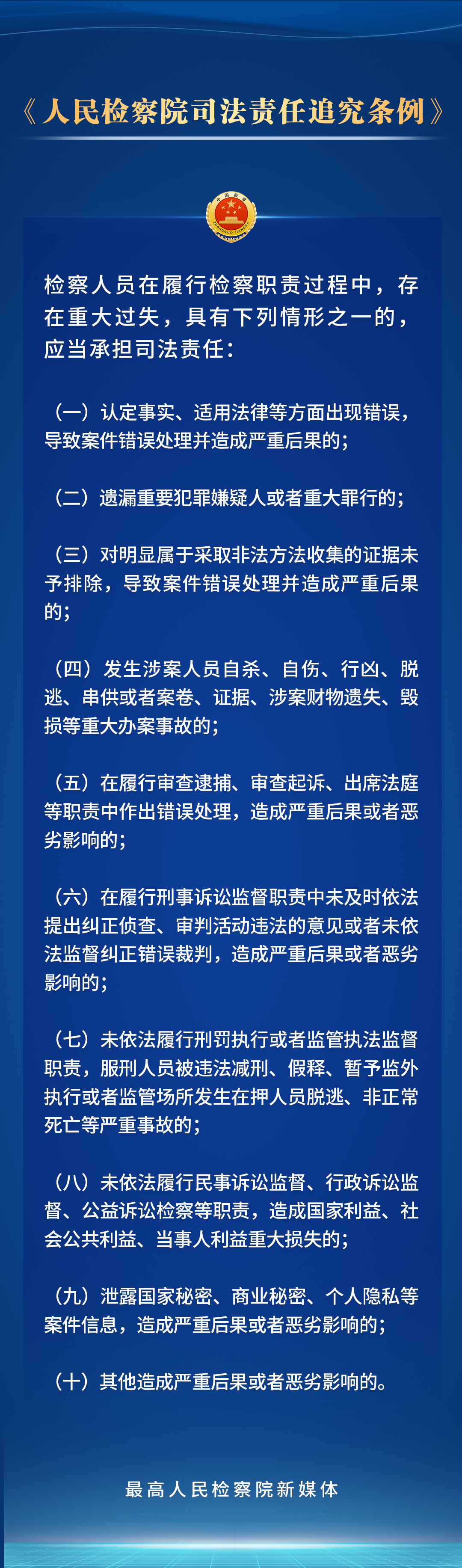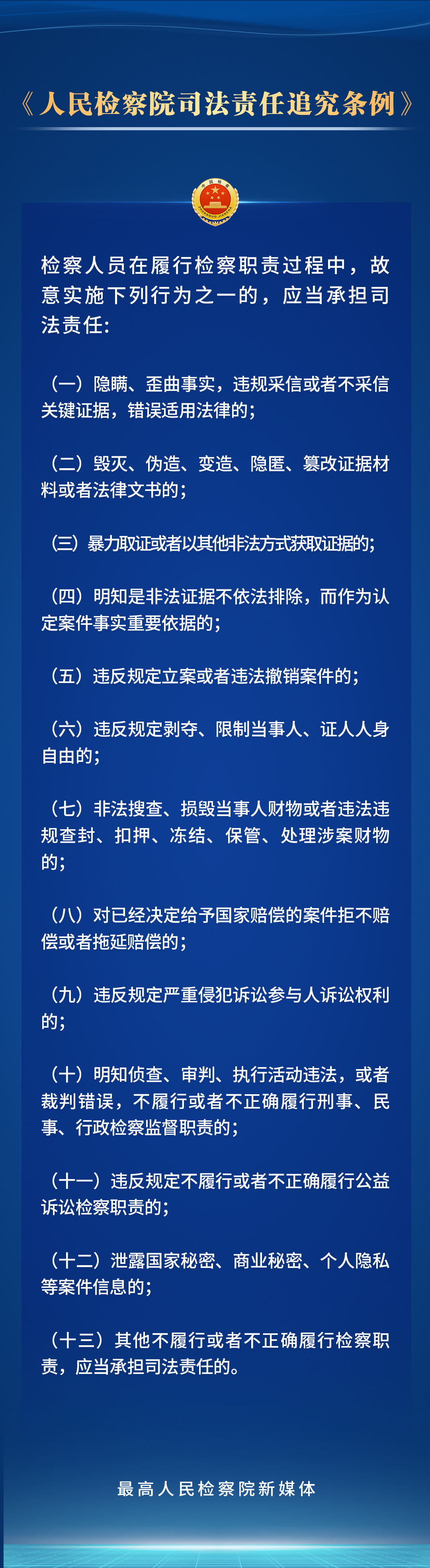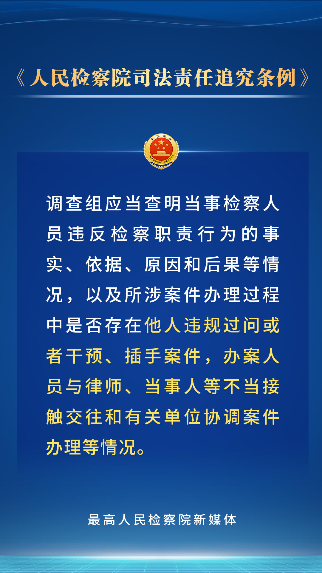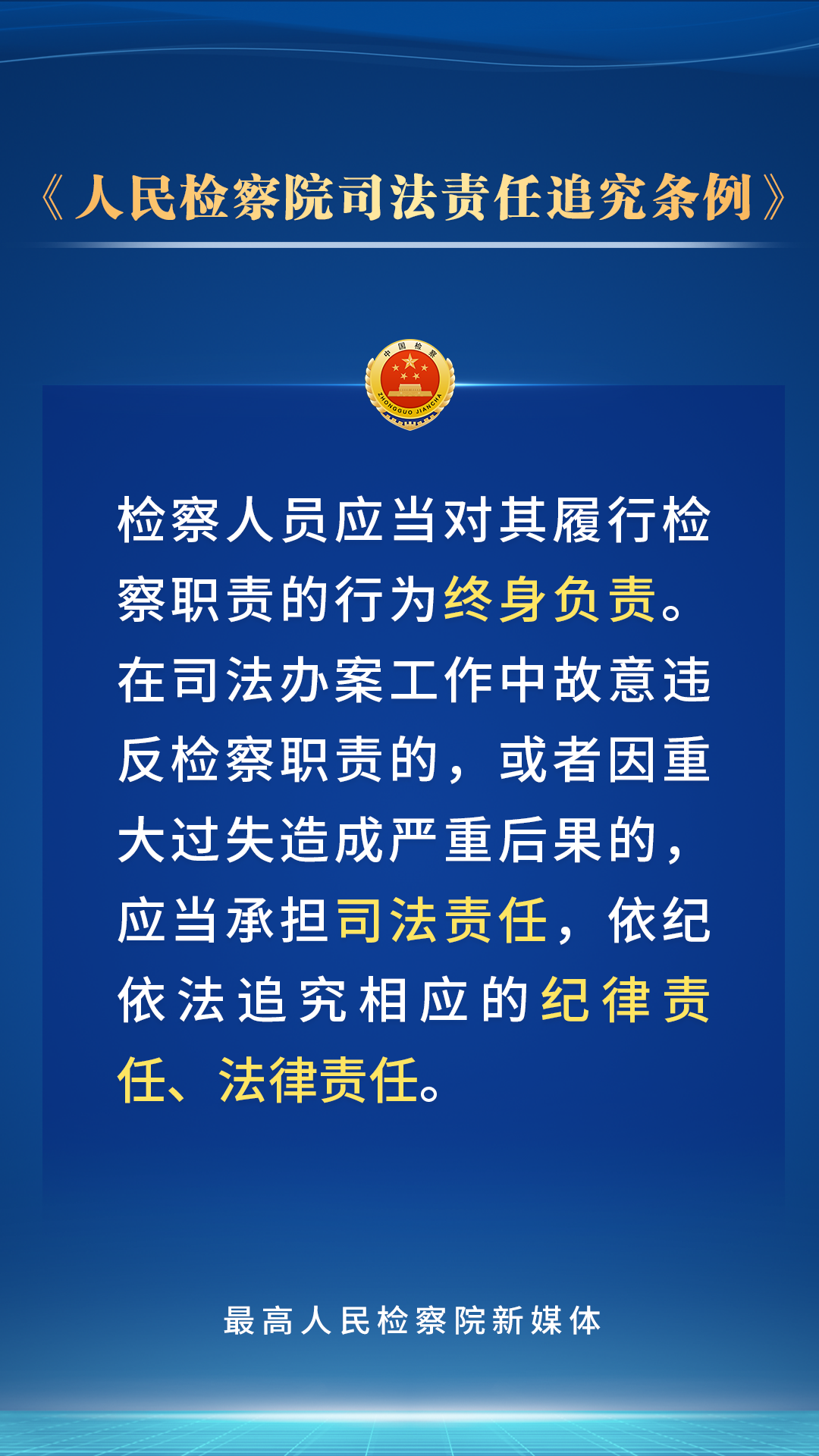 党的二十届三中全会鲜明指出“法治是中国式现代化的重要保障”。为贯彻党的二十大关于“全面准确落实司法责任制”的要求,最高检对《人民检察院司法责任追究条例》进行了修订,进一步完善了司法责任追究的范围、具体情形、程序和工作机制。检察人员的哪些行为应当承担司法责任?会受到哪些处理处分?一组海报带您了解。