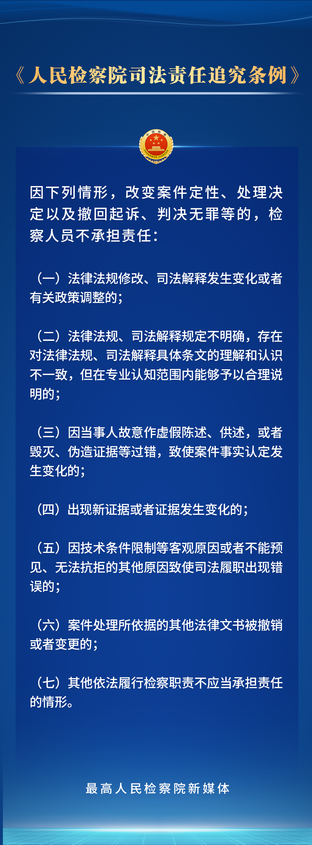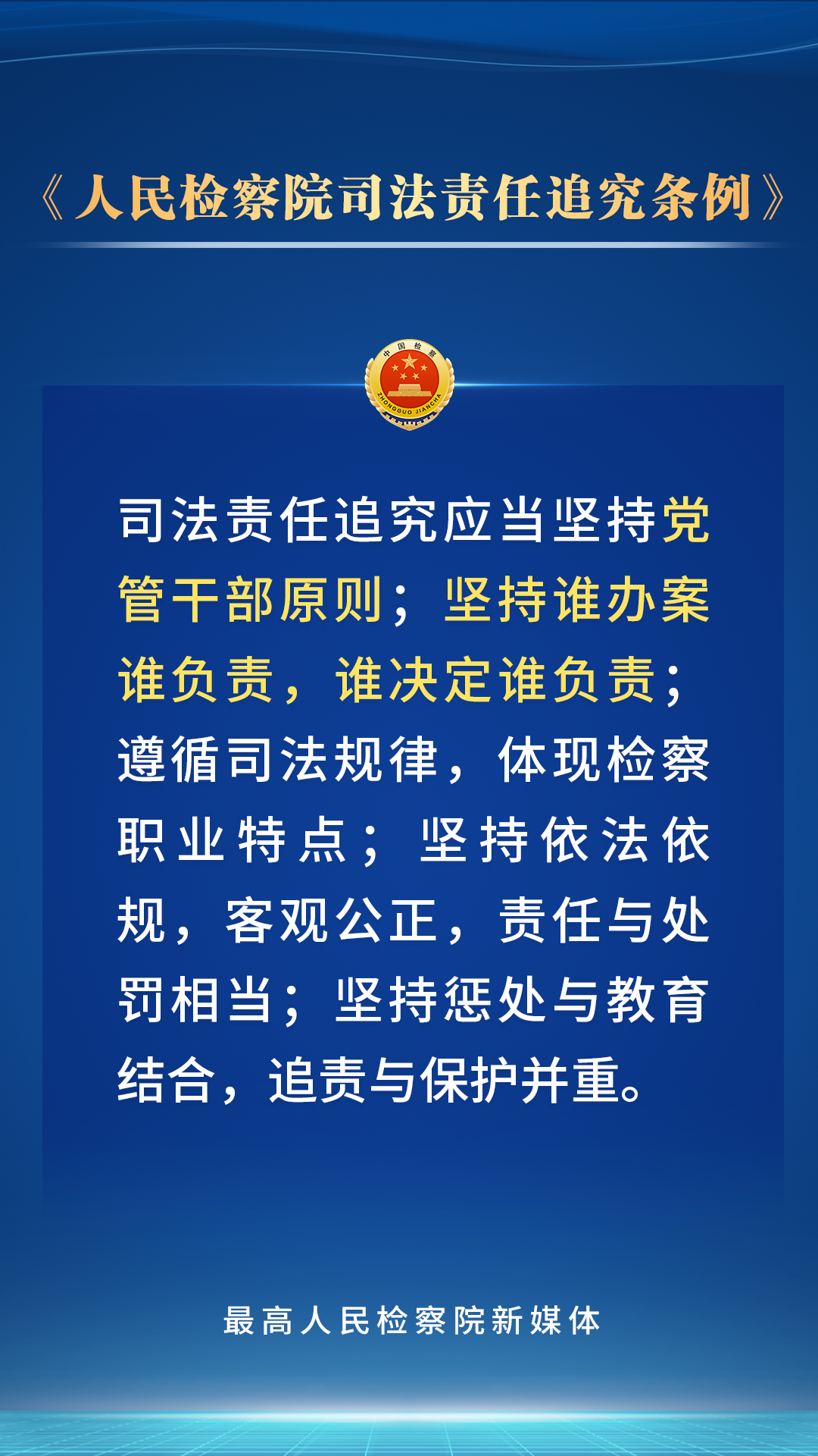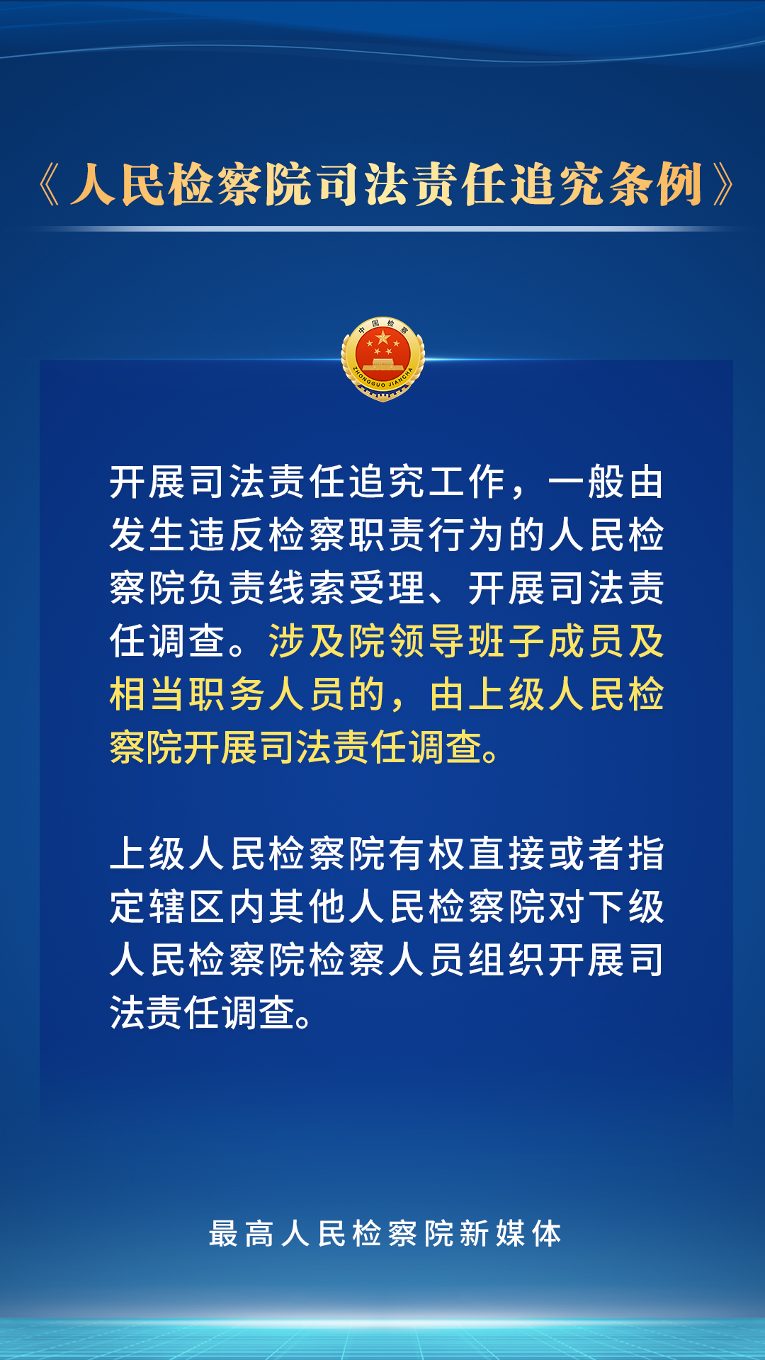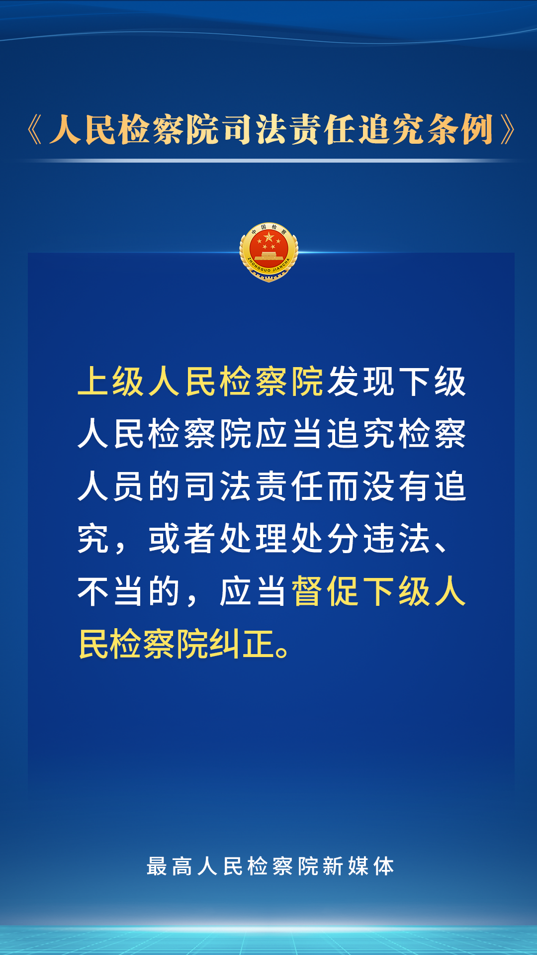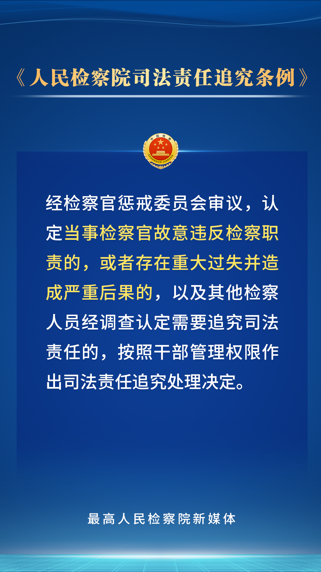 党的二十届三中全会鲜明指出“法治是中国式现代化的重要保障”。为贯彻党的二十大关于“全面准确落实司法责任制”的要求,最高检对《人民检察院司法责任追究条例》进行了修订,进一步完善了司法责任追究的范围、具体情形、程序和工作机制。检察人员的哪些行为应当承担司法责任?会受到哪些处理处分?一组海报带您了解。