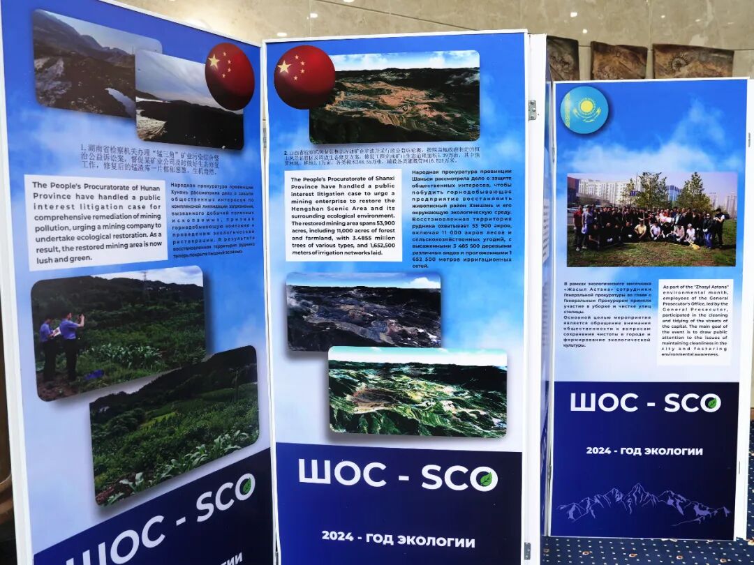 7月25日,在吉尔吉斯共和国首都比什凯克召开的第二十二次上海合作组织成员国总检察长会议上,主会场旁大厅里举办的上合组织生态年专题展十分醒目,其中,三组反映中国公益诉讼检察成效的展板引起参会代表的赞赏议论、驻足关注。
