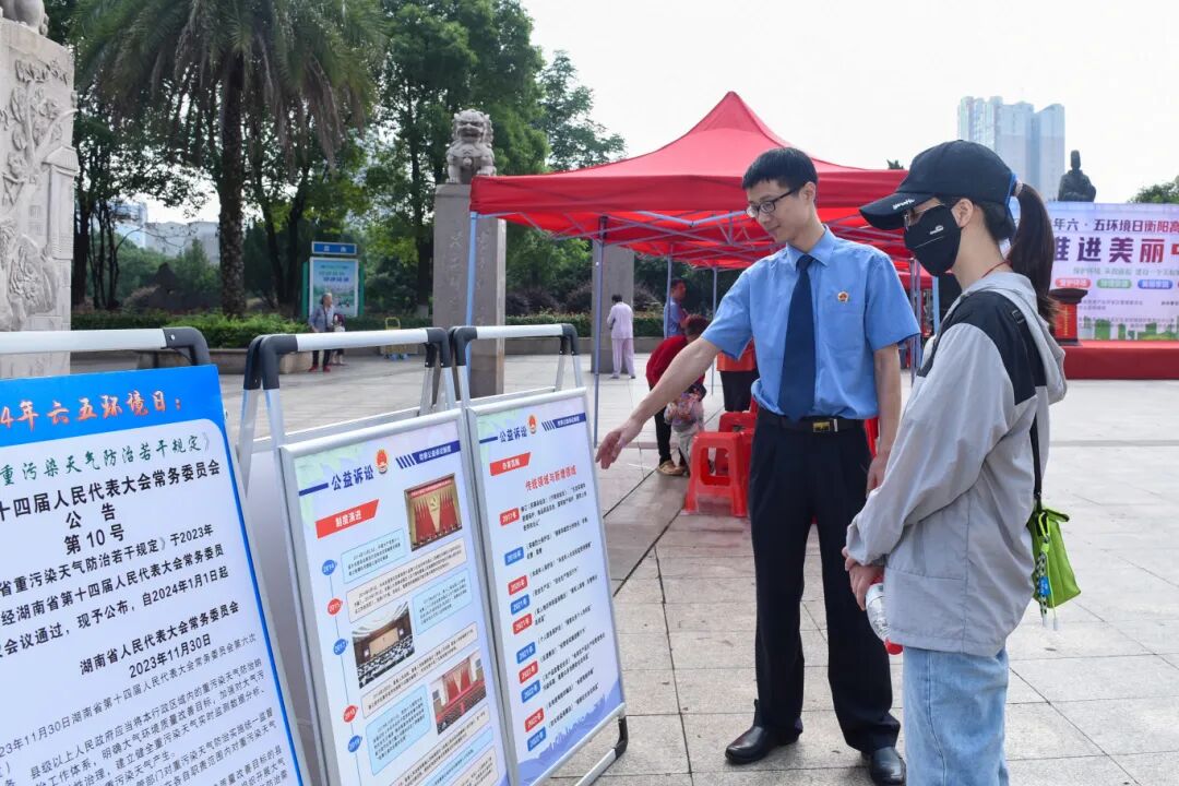 蒸湘区人民检察院在蒸湘区金钟大雁城广场开展“六•五”世界环境日宣传活动,动员广大市民守护绿水青山,共筑美好家园。