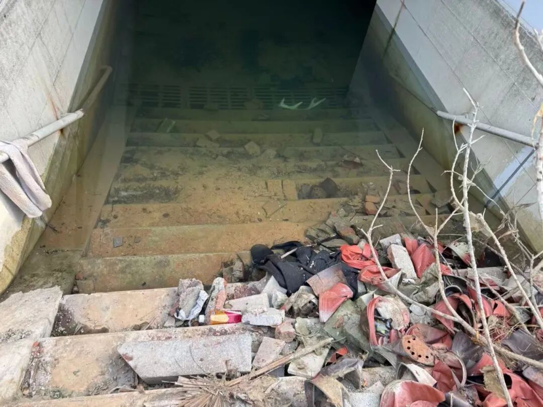 收到线索后,蒸湘区检察院公益诉讼检察部门办案检察官第一时间实地勘查。经调查,检察官发现通道内积水深达一米,塑料袋、枯枝等垃圾漂浮其上,散发着刺鼻异味;照明设施早已锈迹斑斑、完全失效,两侧没有任何防护挡板,行人稍不留意就可能滑倒或跌落,安全隐患重重。