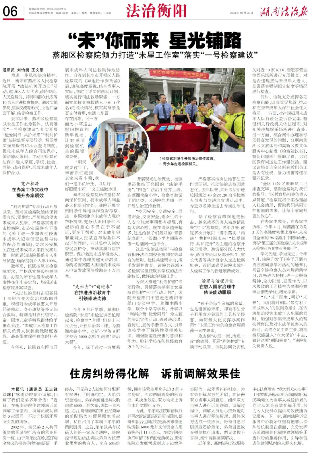 去年以来,蒸湘区检察院以未星工作室为载体,认真落实“一号检察建议”,扎实开展“检爱同行 共护未来”“利剑护蕾”法律监督专项行动。督促落实强制报告和从业查询制度,强化未成年人综合司法保护,依法能动履职,主动将检察司法保护融入家庭、学校、社会、网络、政府保护,形成未成年人保护合力。
