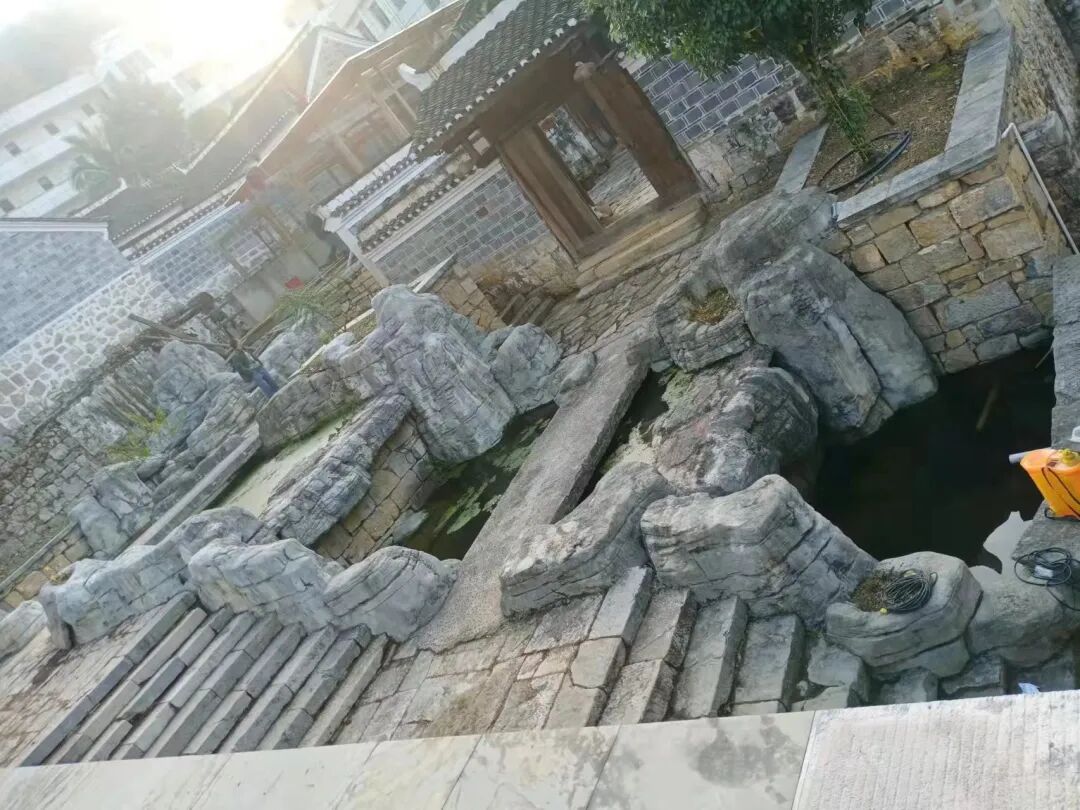 马二元帅府内违规添建的建筑物玻璃房、假山、水池整改前后
