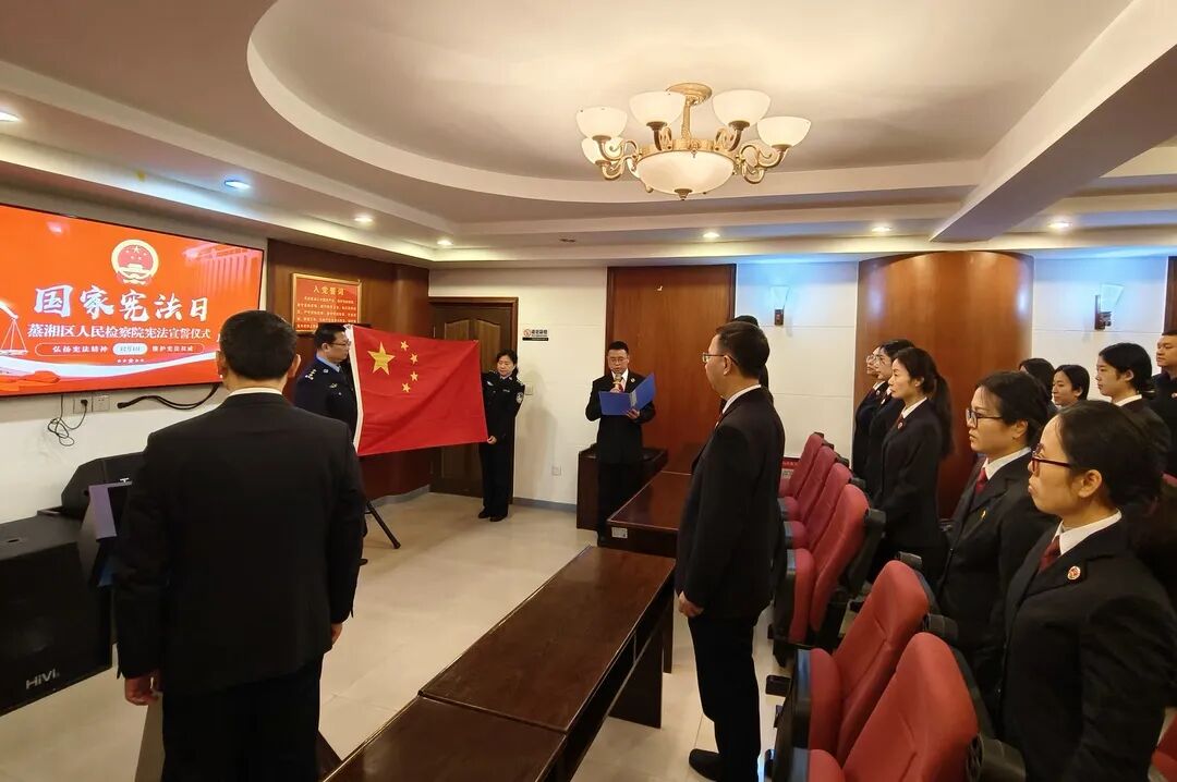 “我宣誓:忠于中华人民共和国宪法,维护宪法权威,履行法定职责……”12月4日,为进一步弘扬宪法精神、树立宪法权威,切实增强检察人员的使命感、责任感,蒸湘区人民检察院举行宪法宣誓仪式。
