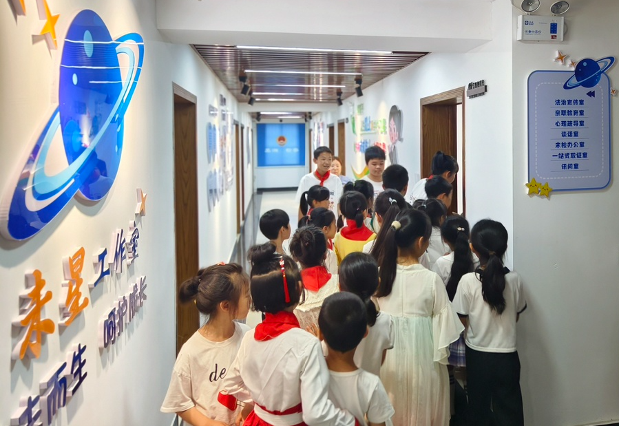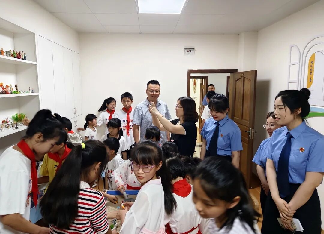未检干警带领大家参观了“未星”工作室,介绍了未成年人检察职能、检察办案流程等,孩子们跟着脚步边走边看,边听边学,身临其境感受检察工作日常。期间,孩子们还踊跃参与了“亲职疏导室”、“心理疏导室”等项目体验,通过沉浸式体验、零距离讲解,孩子们进一步了解了“应未而生 呵护成长”未检工作精神,深切感受到了检察机关对未成年人的精心关爱和细心呵护。法治的种子深深扎进了每个孩子的心中,生根发芽,茁壮成长。