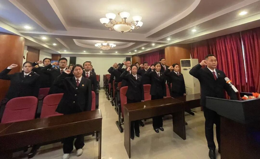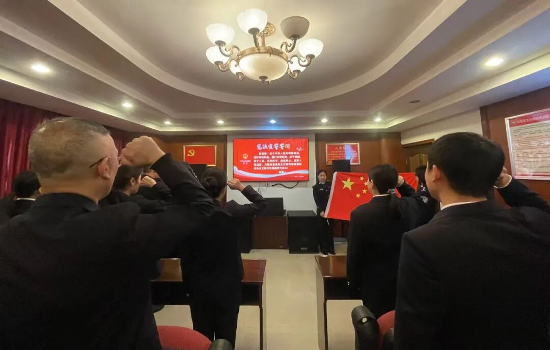上午9时,宣誓仪式在庄严的国歌声中拉开序幕,宣誓现场庄重、肃穆,宣誓台上摆放着《中华人民共和国宪法》。全体干警整齐肃立,奏唱中华人民共和国国歌,领誓人手抚宪法、领诵誓词,其他宣誓人跟颂誓词:“我宣誓:忠于中华人民共和国宪法,维护宪法权威,履行法定职责,忠于祖国、忠于人民,恪尽职守、廉洁奉公,接受人民监督,为建设富强民主文明和谐美丽的社会主义现代化强国努力奋斗!”