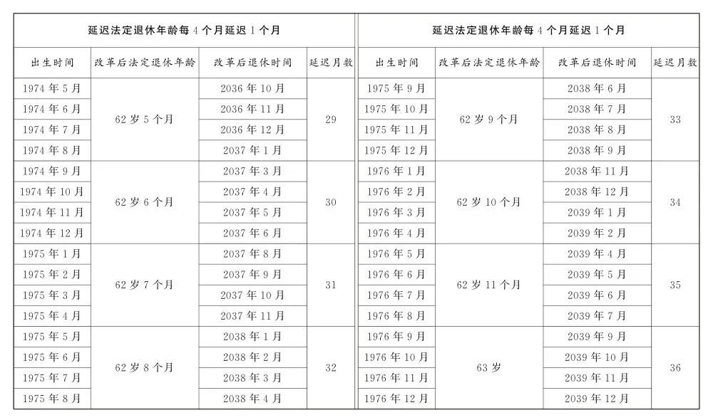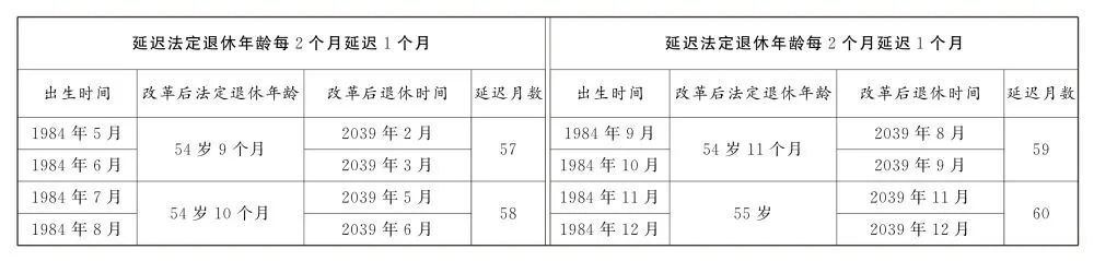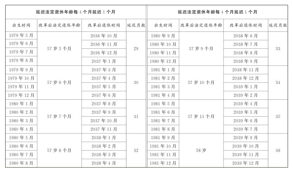 第一条 从2025年1月1日起,男职工和原法定退休年龄为五十五周岁的女职工,法定退休年龄每四个月延迟一个月,分别逐步延迟至六十三周岁和五十八周岁;原法定退休年龄为五十周岁的女职工,法定退休年龄每二个月延迟一个月,逐步延迟至五十五周岁。国家另有规定的,从其规定。