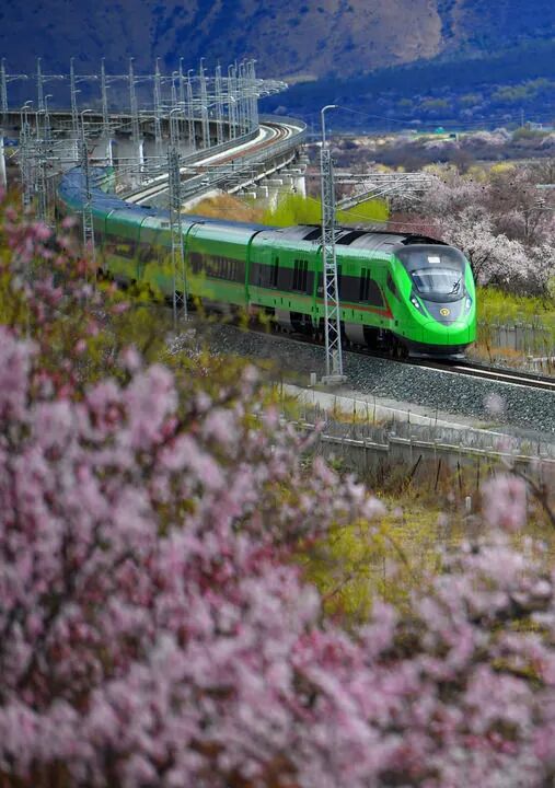 秋日里,雅鲁藏布江河谷中,拉林铁路上的复兴号列车呼啸而过。