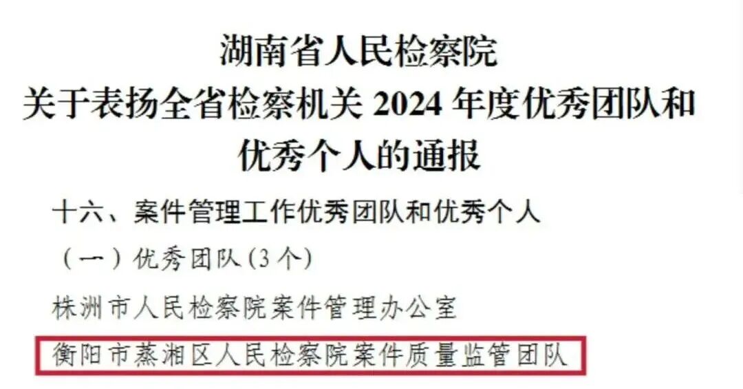 2月17日,蒸湘区检察院案件质量监管团队荣获全省案件管理工作优秀团队!